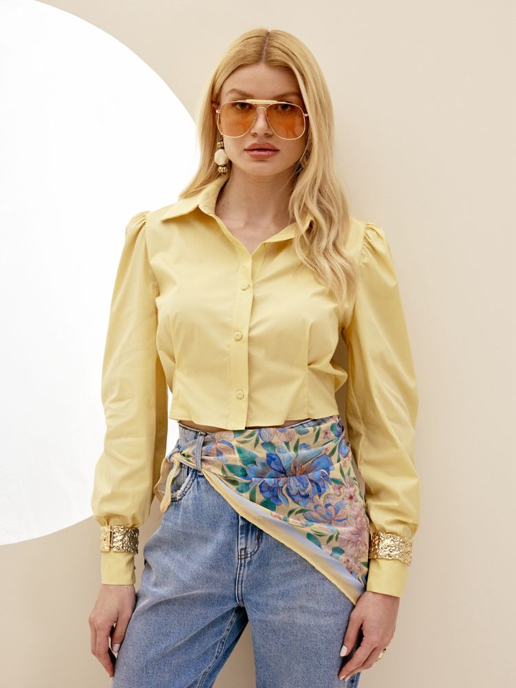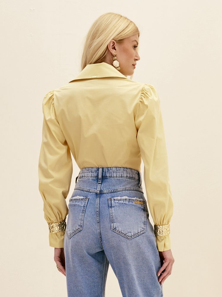 Confeccionada em tecido leve de alta qualidade, ela apresenta modelagem estruturada com ombreiras sutis e mangas longas bufantes que trazem imponência ao visual.