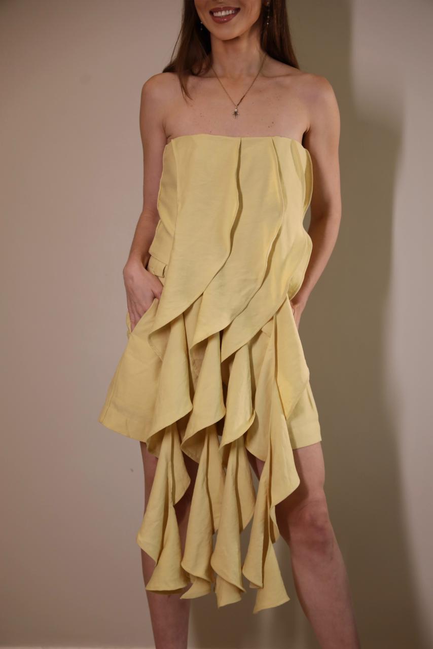 Top de babado alfaiataria, modelagem tomara que caia sem alças, múltiplas camadas de babados sobrepostos criando volume e movimento, comprimento assimétrico com pontas alongadas que descem além da barra principal, fechamento traseiro por zíper, silhueta justa na base com babados, tecido estruturado.